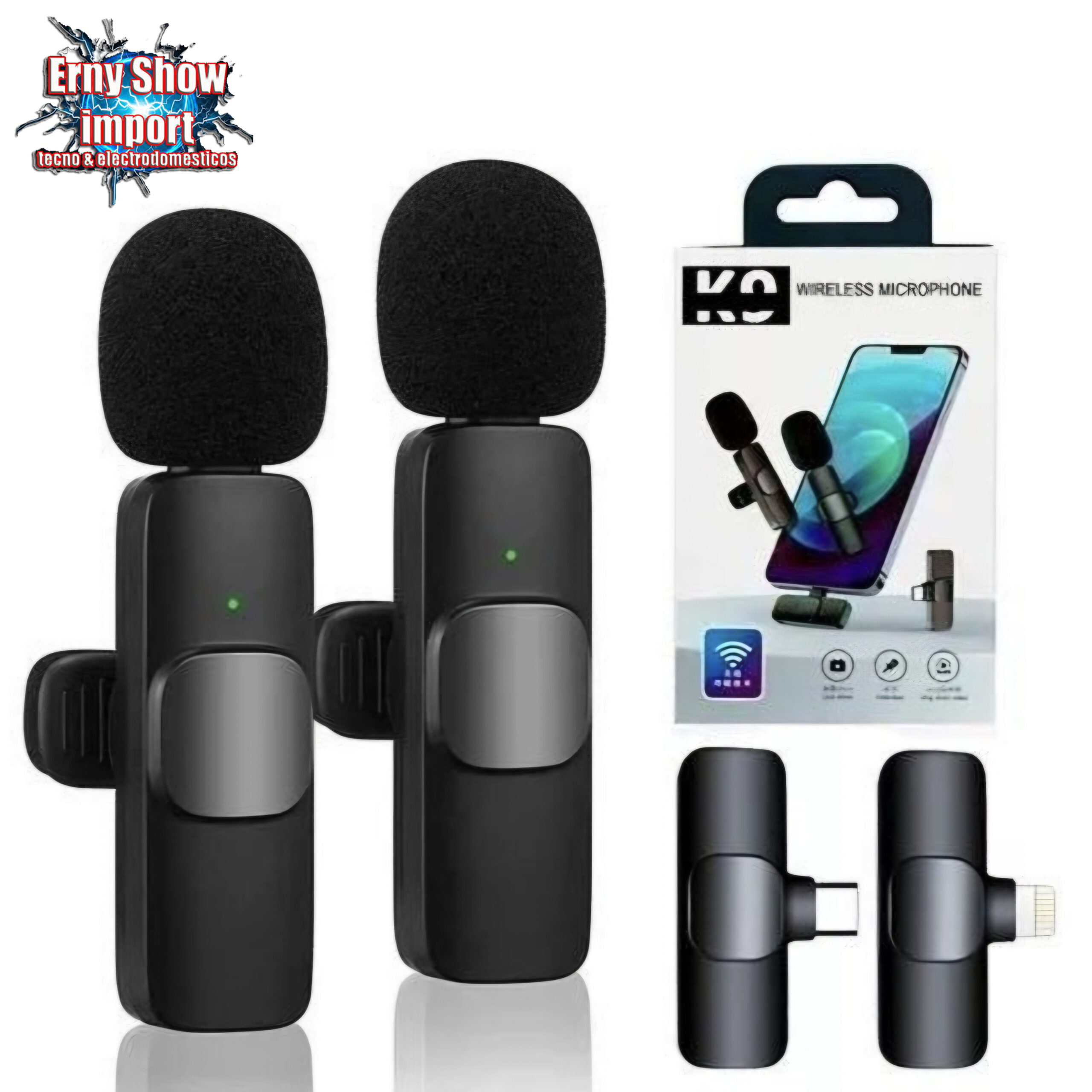 MICROFONO INALAMBRICO CORBATERO K9 USB TIPO C + LIGHTNING – 2 UNIDADES – ADAPTADOR PARA IPHOE – COLOR NEGRO
